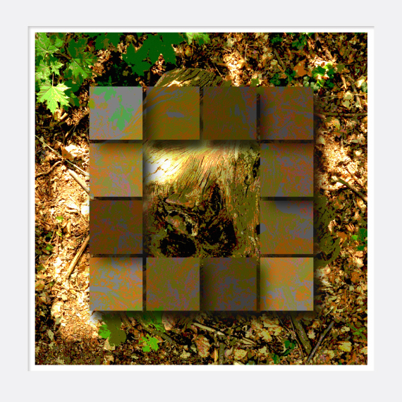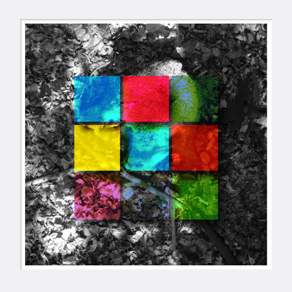 In het tweedimensionale vlak van de foto wordt digitaal een serie vierkanten met licht en schaduw effecten toegevoegd waardoor er een ruimtelijke werking tot stand wordt gebracht.